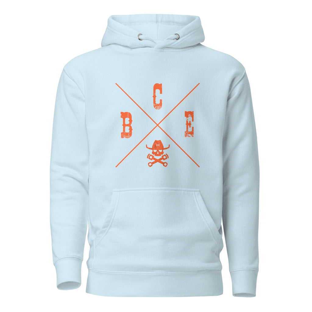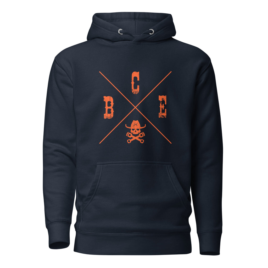 BIKER COWBOY ENDURO (BCE) X LOGO HOODIE. Now this is where it's at! Who knew that the softest hoodie you'll ever own comes with such a cool design. You won't regret buying this classic streetwear piece of apparel with a convenient pouch pocket and warm hood for chilly evenings.