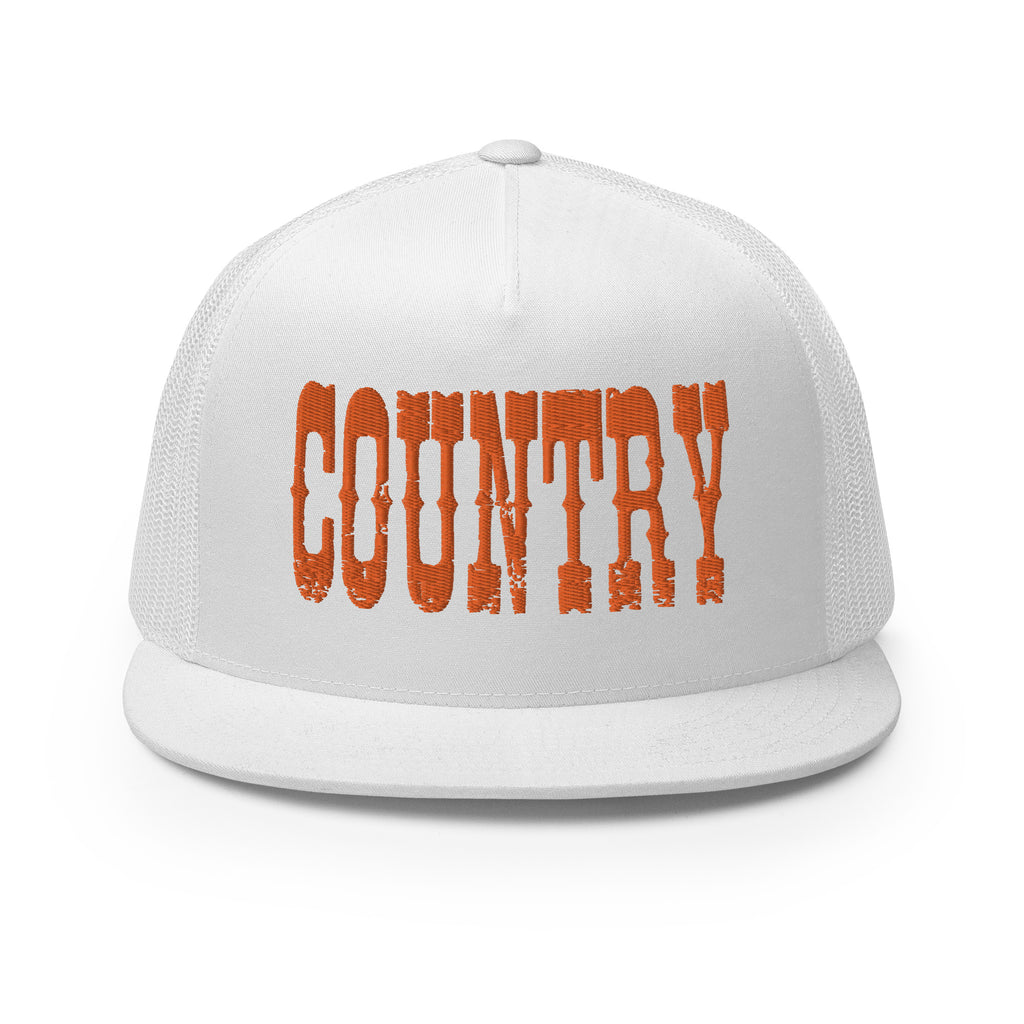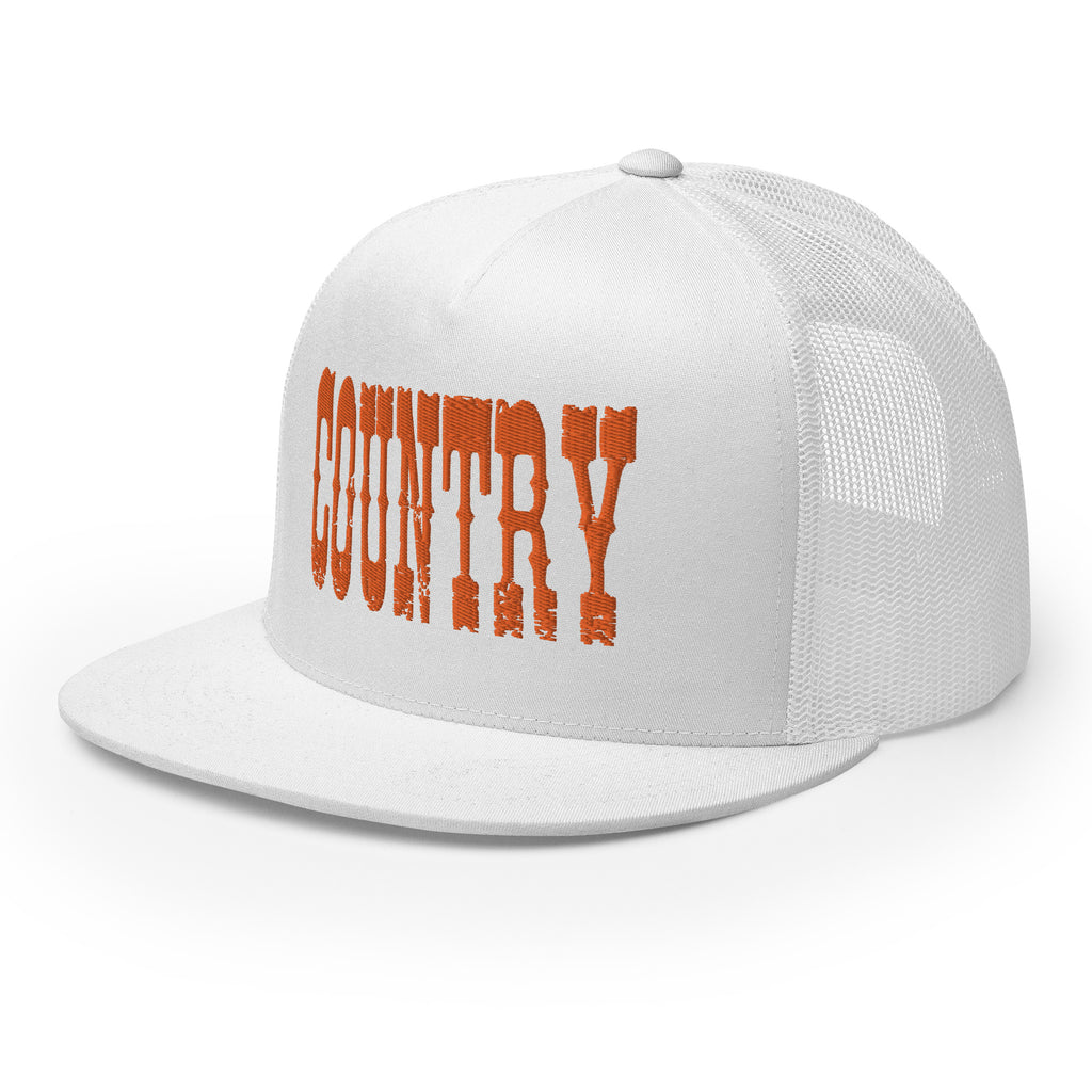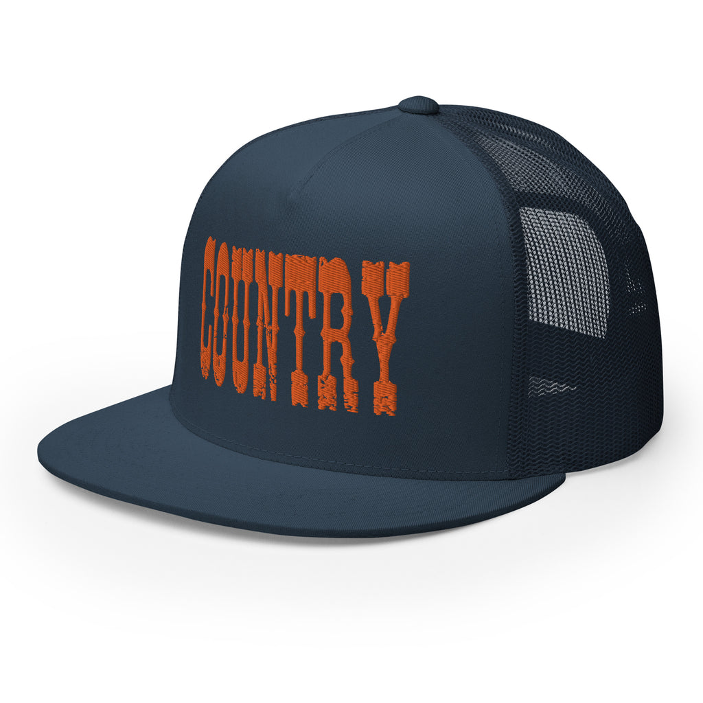 COUNTRY EMBROIDERED PUFFER TRUCKER HAT. Classic trucker cap style with a cool fabric blend.