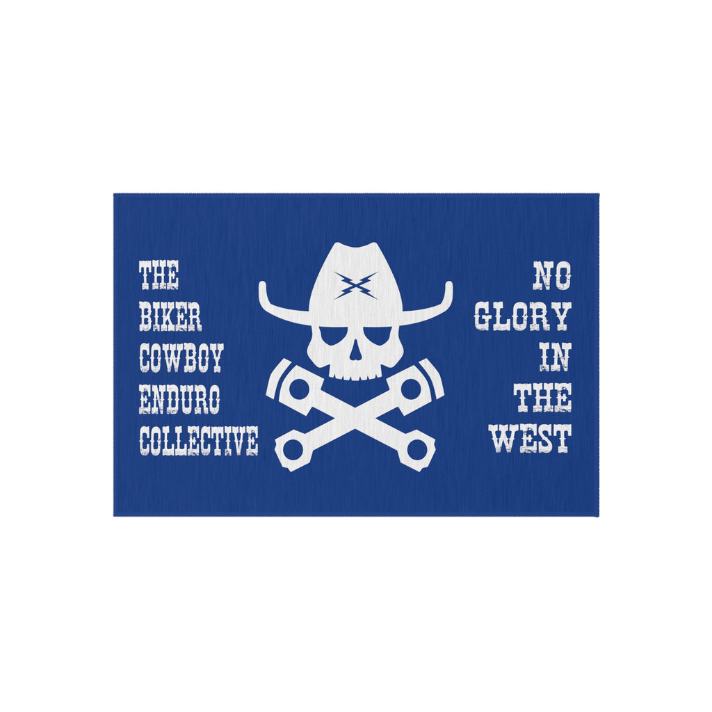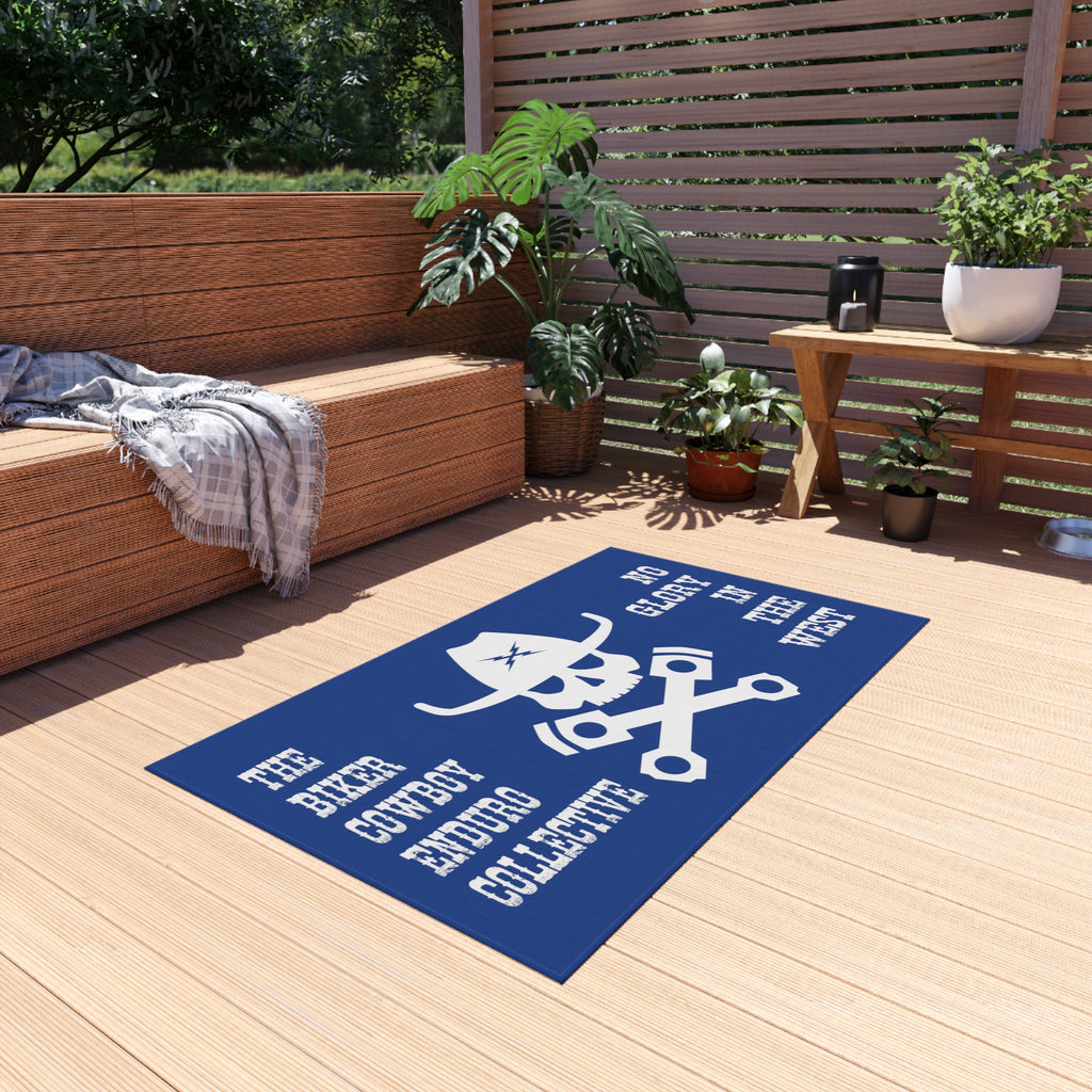BC SKULL NO GLORY IN THE WEST MOTO MAT. Ideal for the campground. It might seem a bit unusual at first—placing one outside, but non-slip outdoor rugs bring alfresco chilling to a whole new level of comfort. These rugs come in many different sizes to fit any patio or porch. Made from polyester chenille fabric— they're very durable, breathable, and dry quickly.