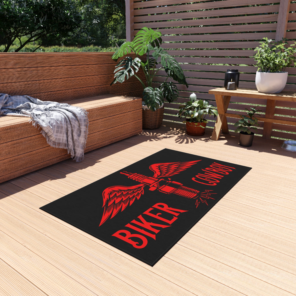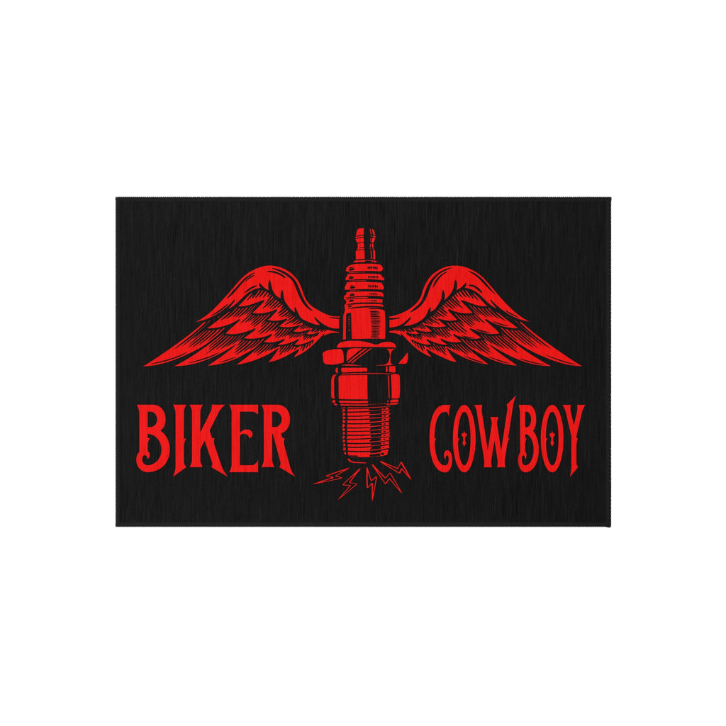 BIKER COWBOY SPARK PLUG MOTO MAT. Ideal for the campground. It might seem a bit unusual at first—placing one outside, but non-slip outdoor rugs bring alfresco chilling to a whole new level of comfort. These rugs come in many different sizes to fit any patio or porch. Made from polyester chenille fabric— they're very durable, breathable, and dry quickly.