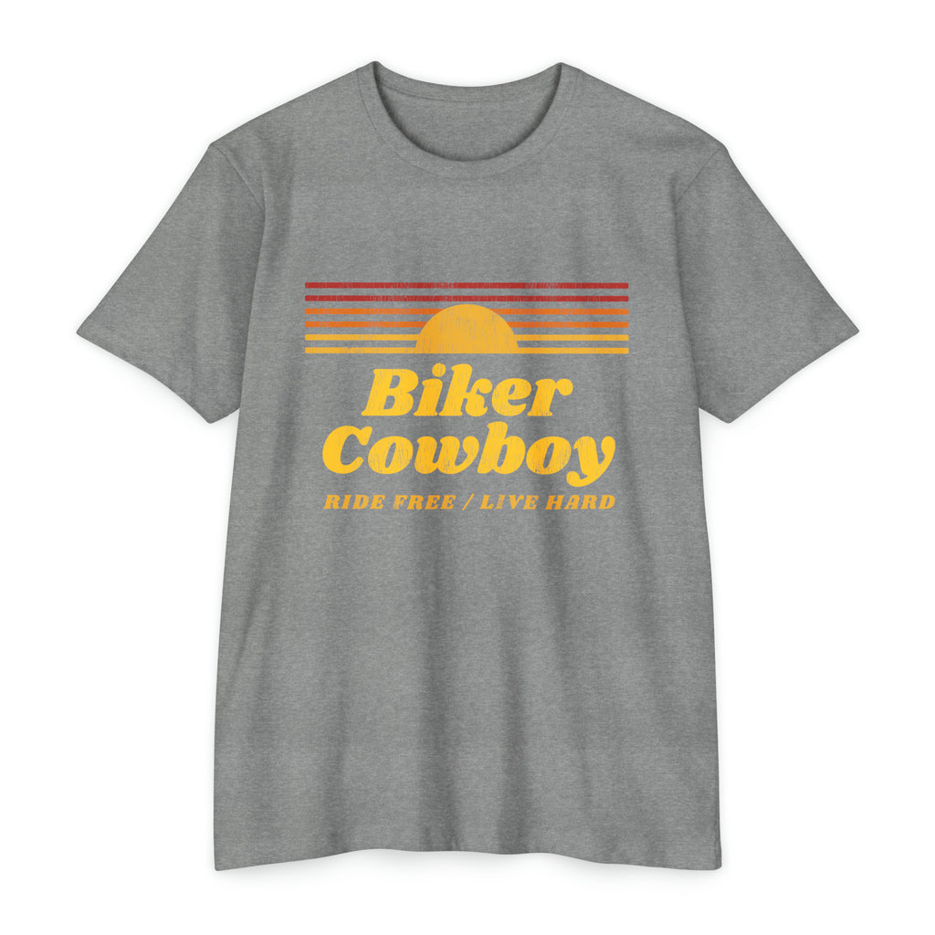 RISE AND SHINE. BIKER COWBOY SUN AND LOGO TEE. I've recently switched to the Next Level 6210 T-shirts as these are stretchy, soft, and withstand shrinking much better than all-cotton shirt. The unisex CVC jersey tee brings together the best of both worlds. The 60% cotton and 40%-polyester blend makes it super soft yet very durable. The shirt has a classic fit with a crewneck 1x1 baby rib collar, and it'll fit any fashion style out there.