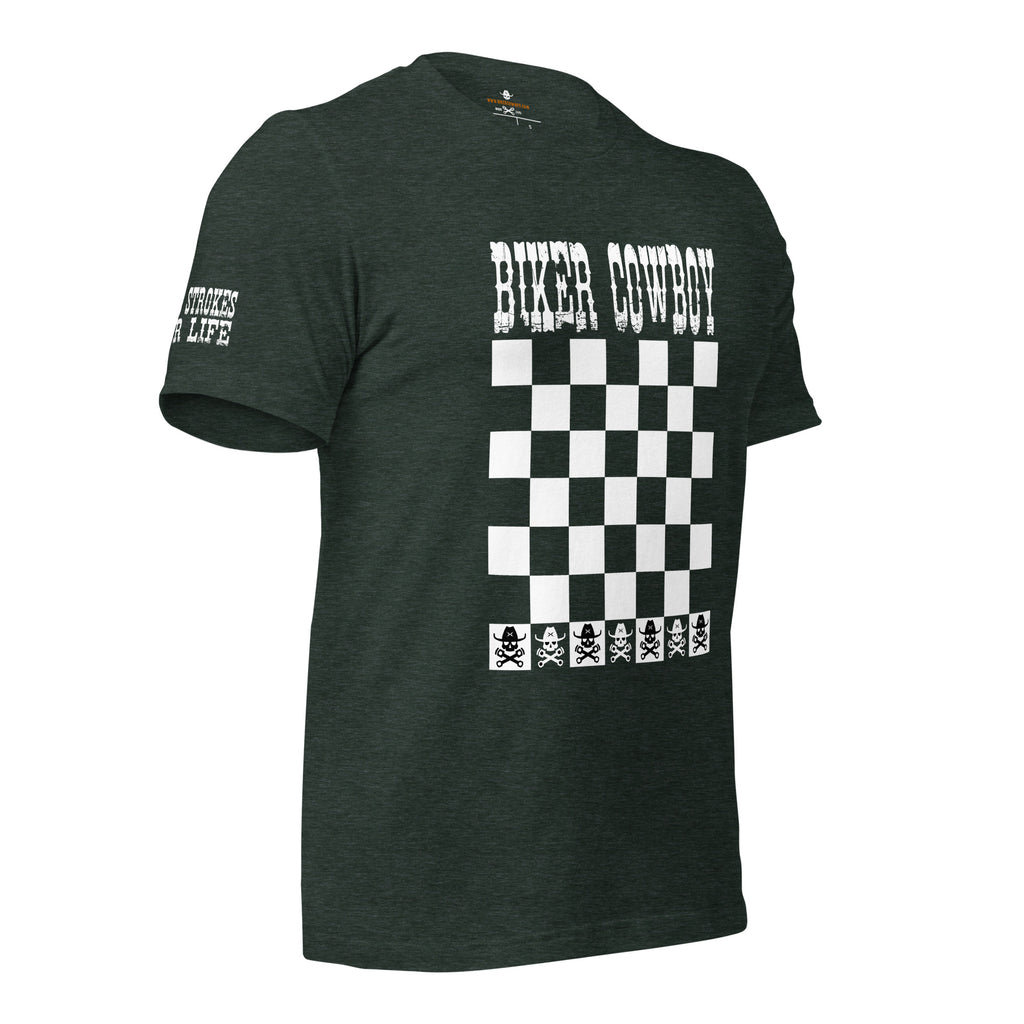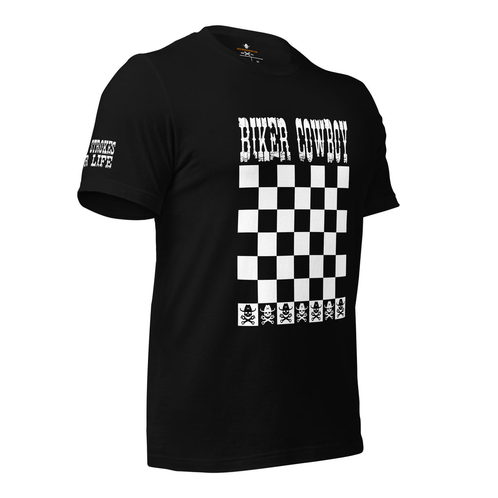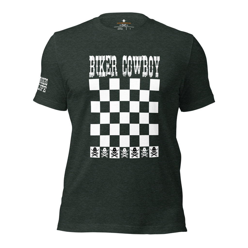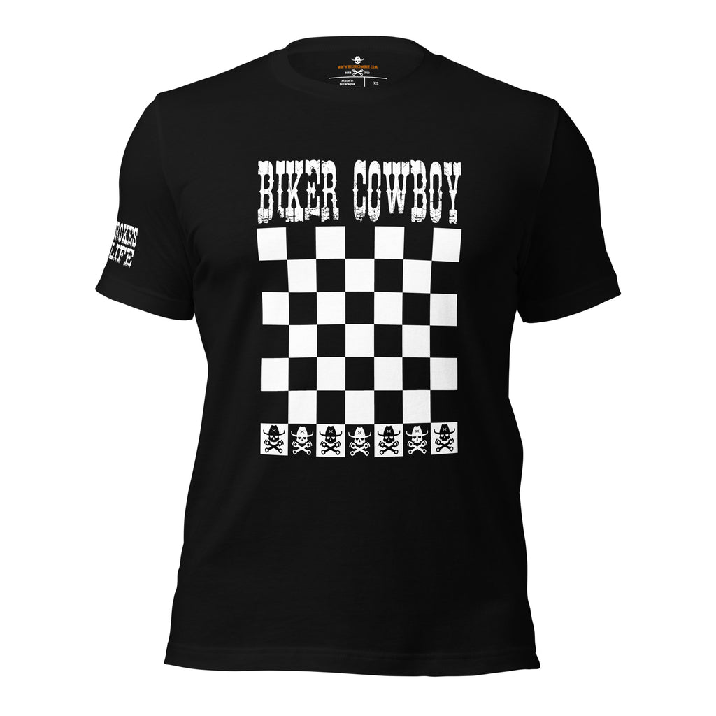 BIKER COWBOY CHECKERS TEE. Representing the cowboy biker in all of us. This t-shirt is everything you've dreamed of and more. It feels soft and lightweight, with the right amount of stretch. Bella+Canvas 3001, just like all our T-shirts.